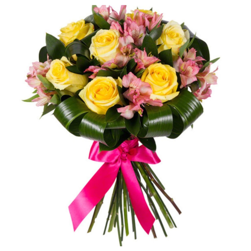 Букет состоит из 7 желтых роз, 7 веток розовой альстромерии, зелень, прозрачная упаковка, атласная лента.
