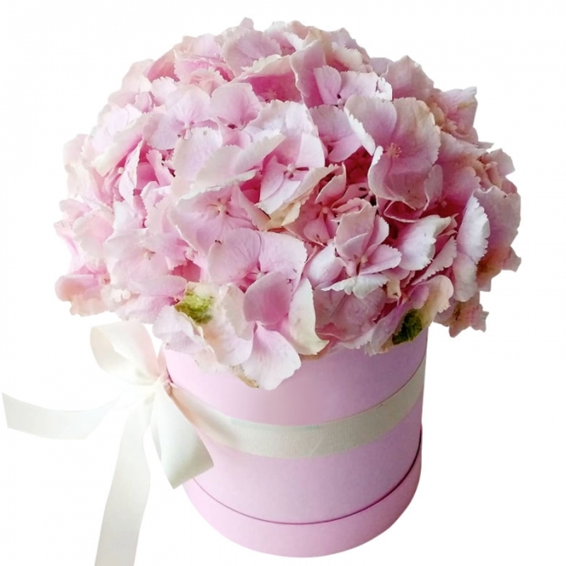 Букет состоит из 3 розовые гортензии, коробка, атласная лента, оазис.
