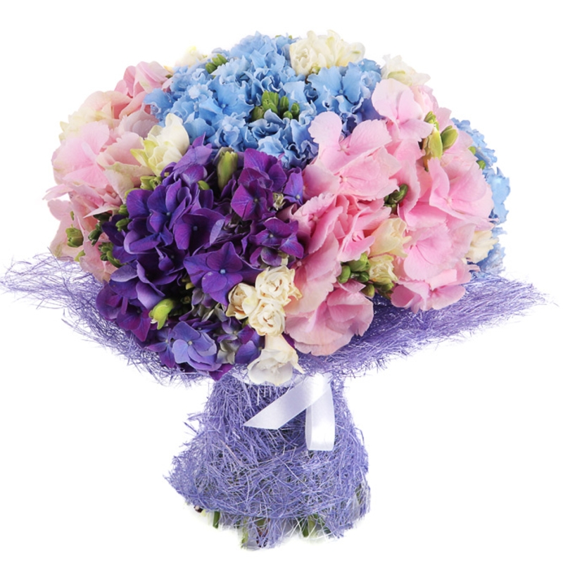 Букет состоит из 7 разноцветных гортензий, 6 веток эустомы, красивая упаковка, атласная лента.
