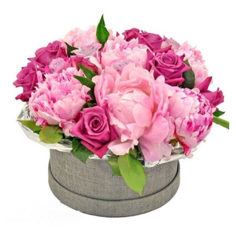 Букет состоит из 7 розовых пионов, 6 розовых роз, коробка.